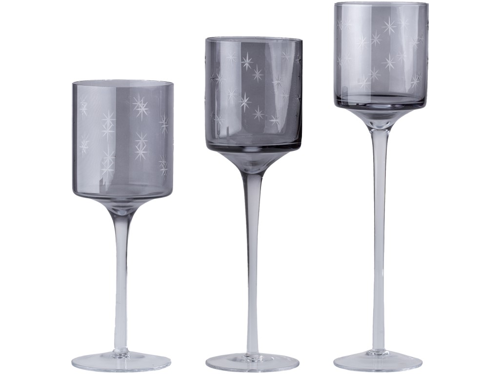 Sada tří skleněných svícnů o rozměrech 90 × 250, 90 × 300 a 90 × 350 mm na nožičkách. Kouřové sklo dodává moderní a sofistikovaný vzhled. Svícny jsou vhodné pro kónické svíčky nebo čajové svíčky a vytvářejí příjemnou a hřejivou atmosféru v interiéru.