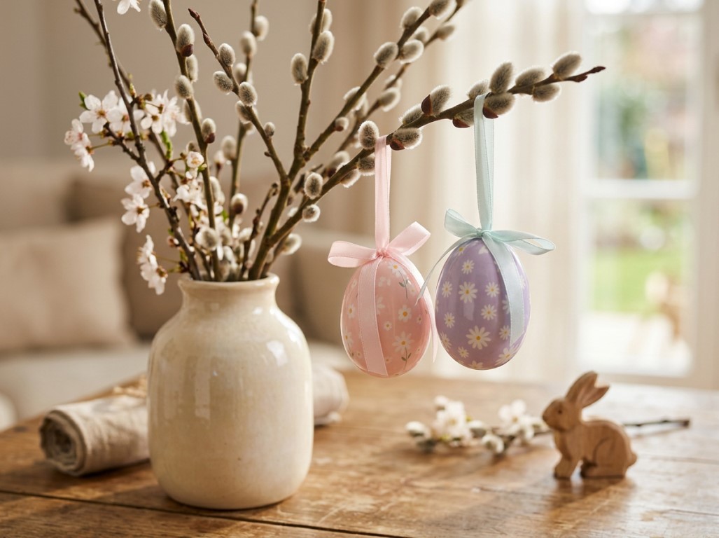 Dekorativní kraslice o rozměru 40×40×55 mm s motivy puntíků a proužků. Provedení je dodáváno v mixu přírodních odstínů.