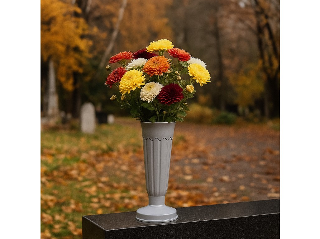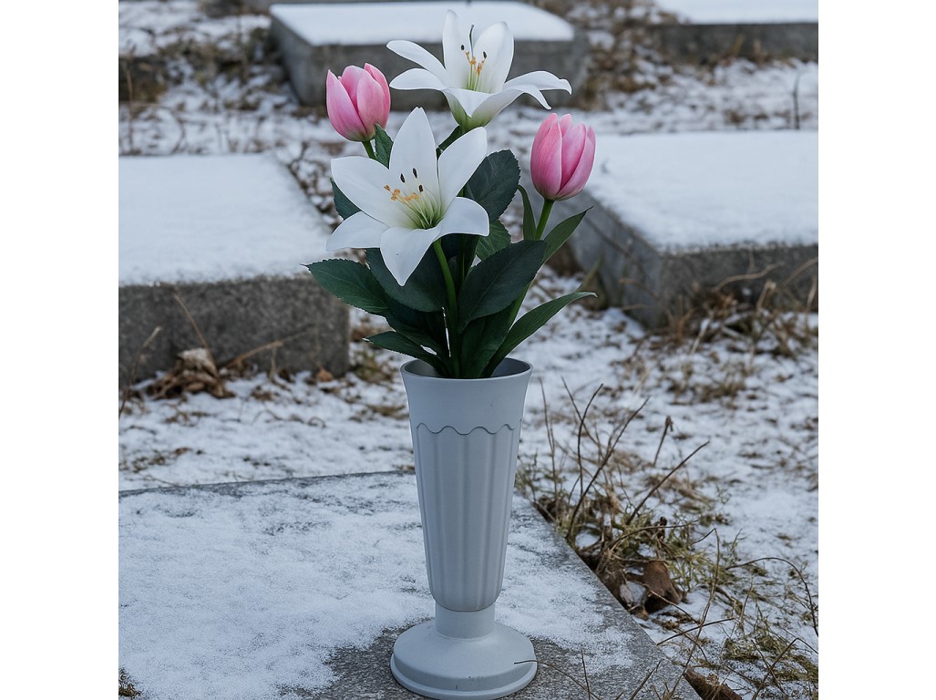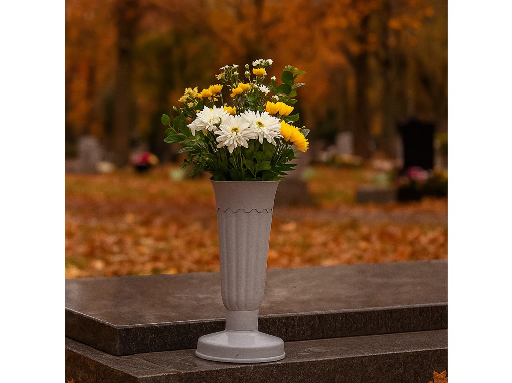A 32 cm súlyú műanyag Madonna temetőváza ideális megoldás a virágok biztonságos és stabil sírra helyezésére. A masszív súlynak köszönhetően a váza ellenáll a szélnek, és biztosítja, hogy a virágok hosszú ideig egyenesen álljanak. Az egyszínű kialakít
