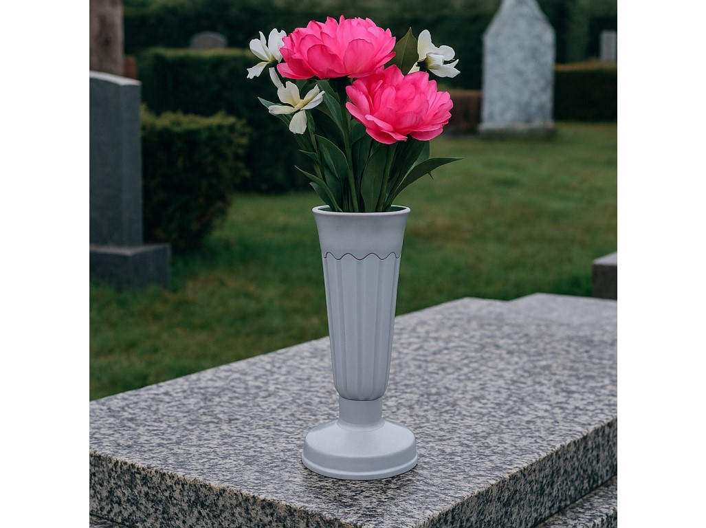 Plastová hřbitovní váza Madona se zátěží o výšce 32 cm je ideálním řešením pro bezpečné a stabilní umístění květin na hrobě. Díky pevné zátěži váza odolává větru a zajišťuje, že květiny zůstanou ve svislé poloze po dlouhou dobu. Jednobarevný design je praktický a nenáročný na údržbu.