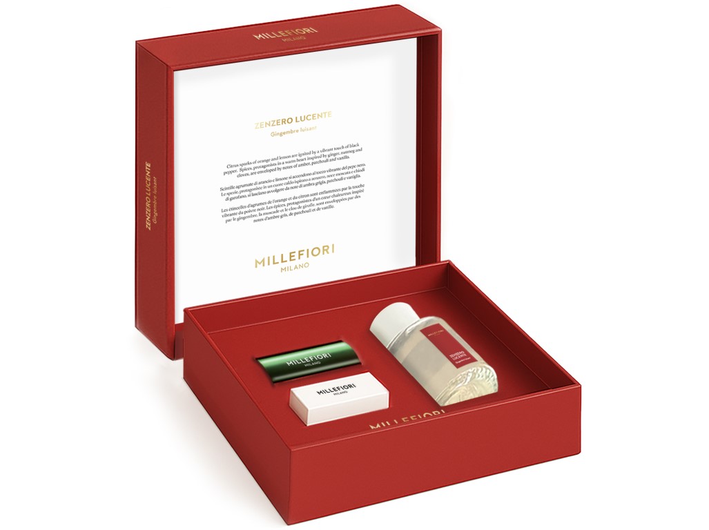 Elegáns részletekkel díszített, gyönyörűen csomagolt Millefiori Milano Zenzero Lucente ajándékszett, amely egy 100 ml-es diffúzort és egy Icon autóillatosítót tartalmaz. Bármely teret vagy utazást pezsgő ünneppé alakít. A boldogsággal teli napokat megelőző finom energia fűszeres jegyekkel és szikrázó fényekkel olvad össze. Élje át a készülődés örömét, a közös koccintások könnyedségét és a szikrát, amely minden pillanatot lángra lobbant. Egy illat, amely felébreszti a hangulatot és meghív az élet ünneplésére.
